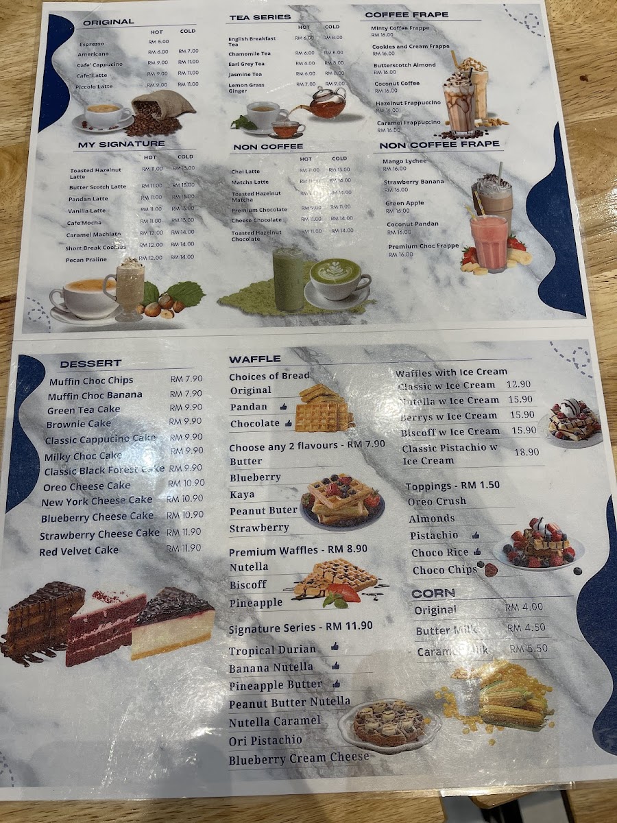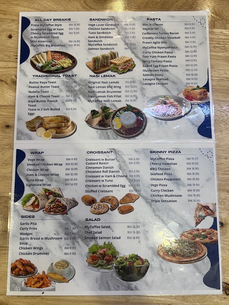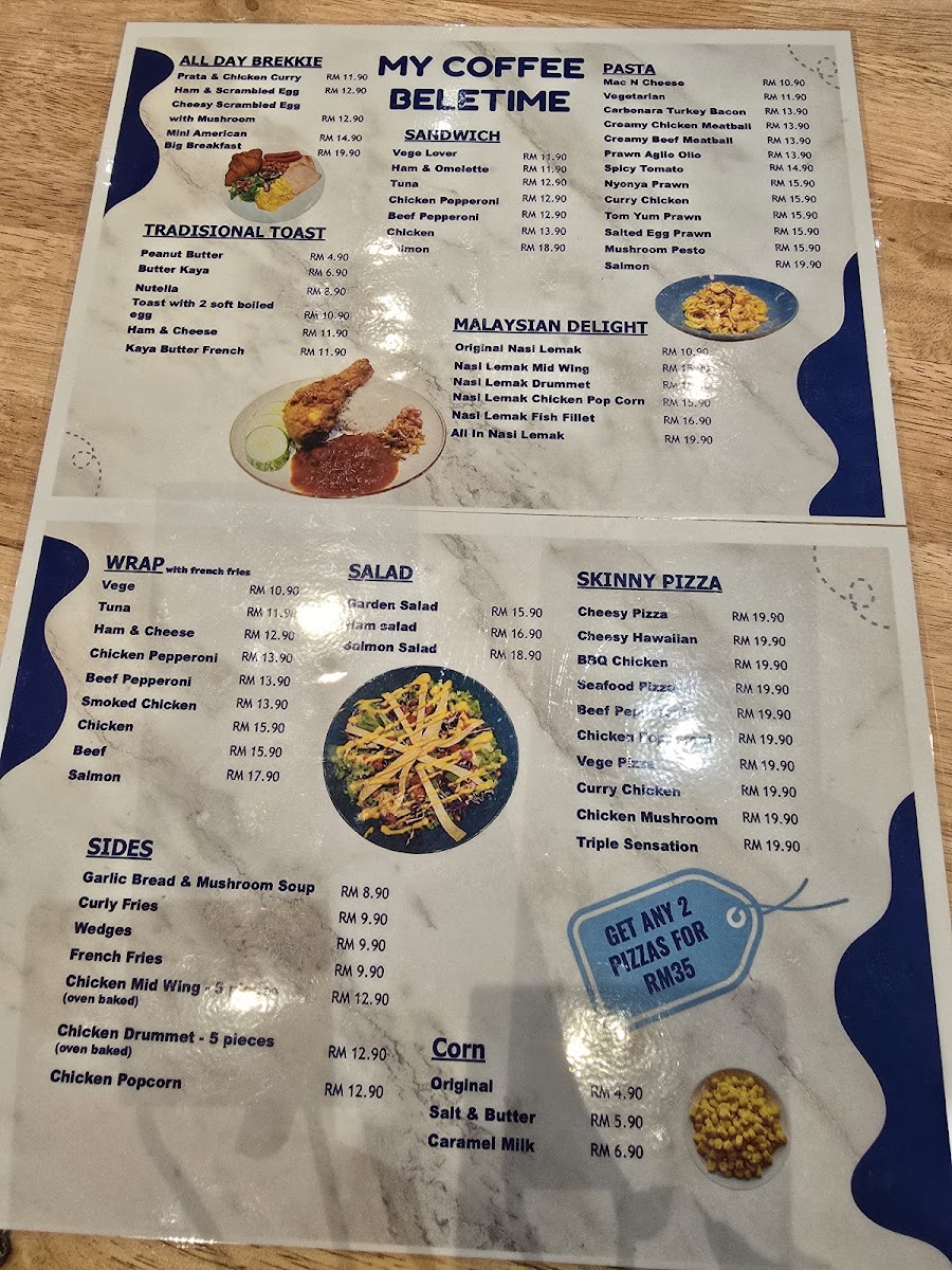 The menu at My Coffee Beletime offers a variety of options suitable for different dining occasions, including breakfast, light meals, and coffee breaks. The selection includes a range of local and international cafe-style dishes alongside a diverse drink menu.
