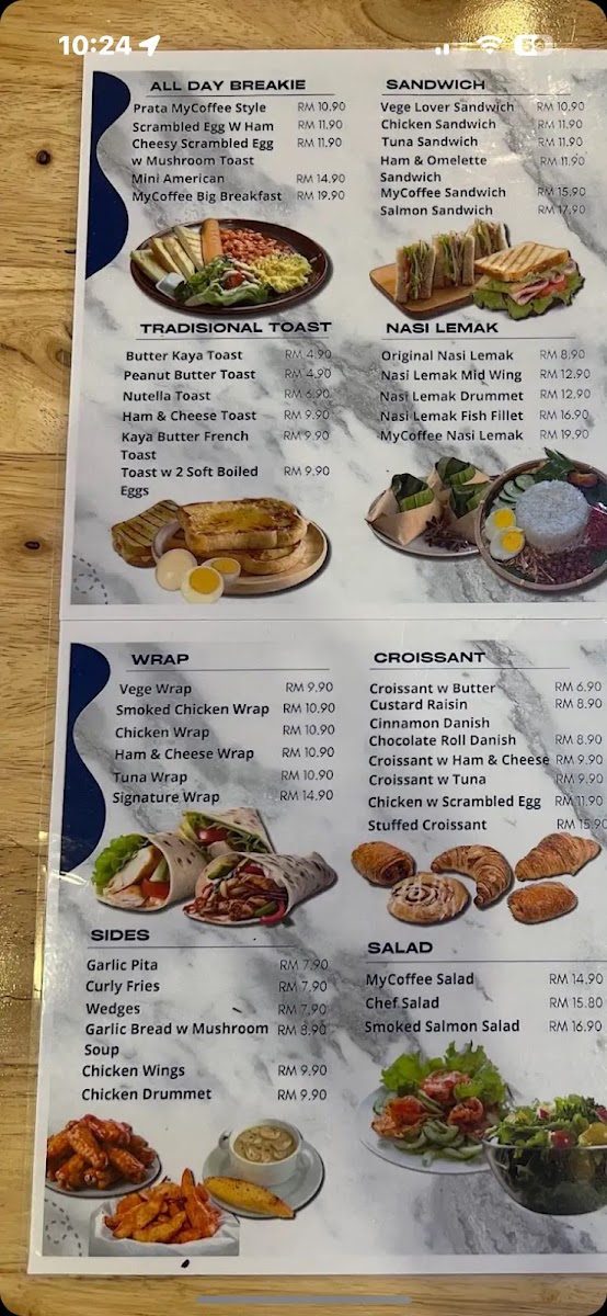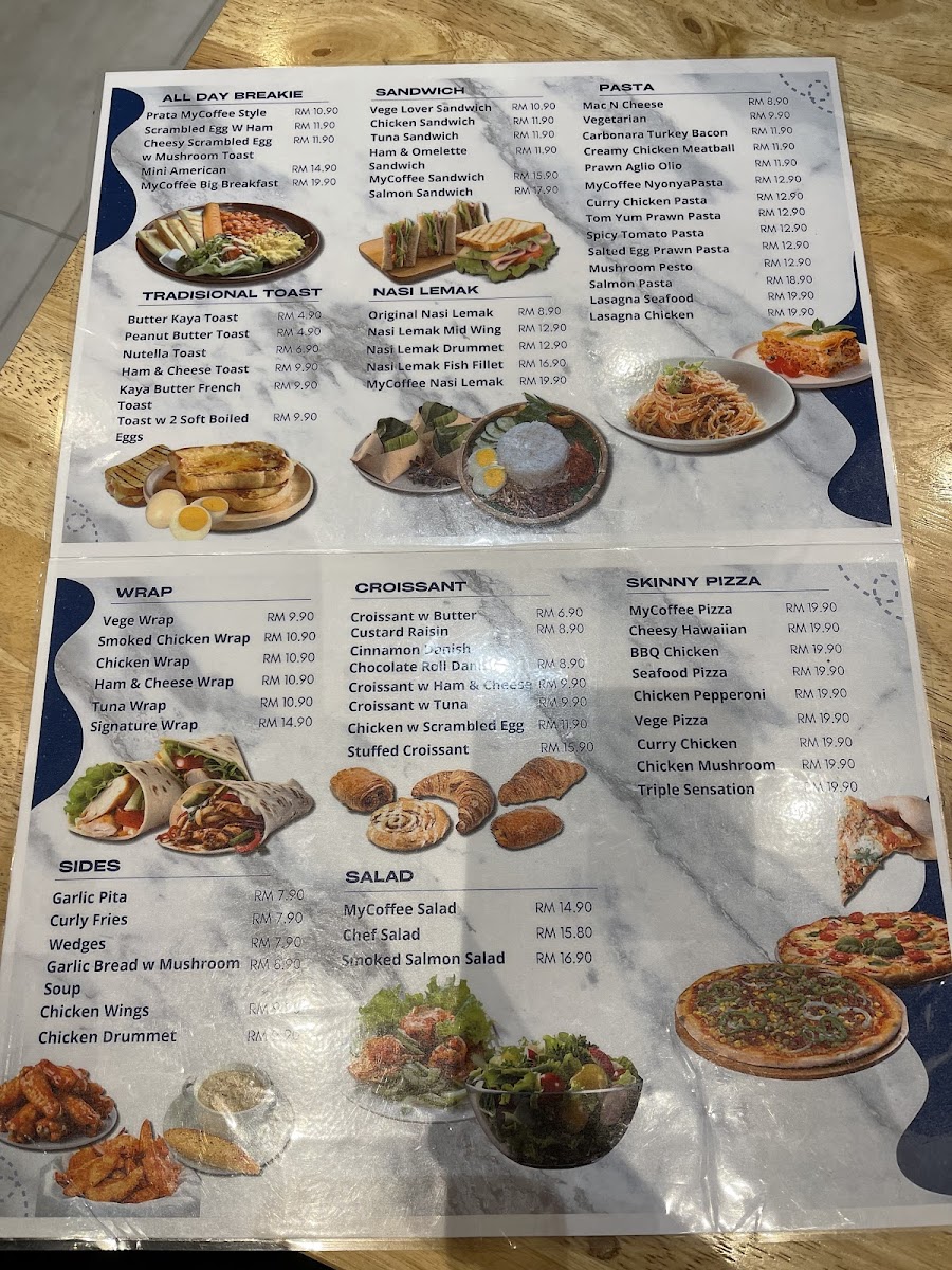 Food offerings prominently feature traditional Malaysian dishes such as nasi lemak, complemented by Western-inspired items like mini American breakfast sets and wraps. Customers can expect both savory meals and lighter fare appropriate for casual dining.